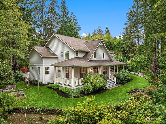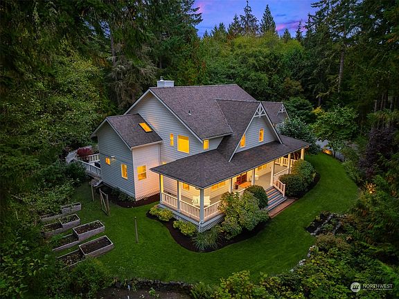 Welcome to your serene island retreat, an enchanting modern farmhouse blending comfort & style. Nestled on a private lot with mature gardens, generous wraparound porch & decks, this home offers tranquility amidst the natural beauty of the PNW. Step inside to find beautiful hardwood floors, custom wainscoting & modern finishes, bathed in natural light. The open-concept great room features vaulted ceilings, a chic fireplace & flexible spaces for indoor-outdoor entertaining. The stunning kitchen, a chef's dream, boasts high-end appliances, storage galore & designer touches. Enjoy the best of both worlds in this private oasis w/ serene views, central location w/ easy access to top-rated schools, island amenities & the ferry.
