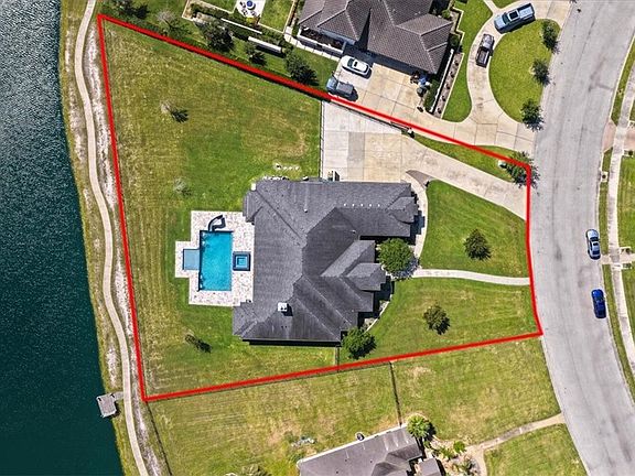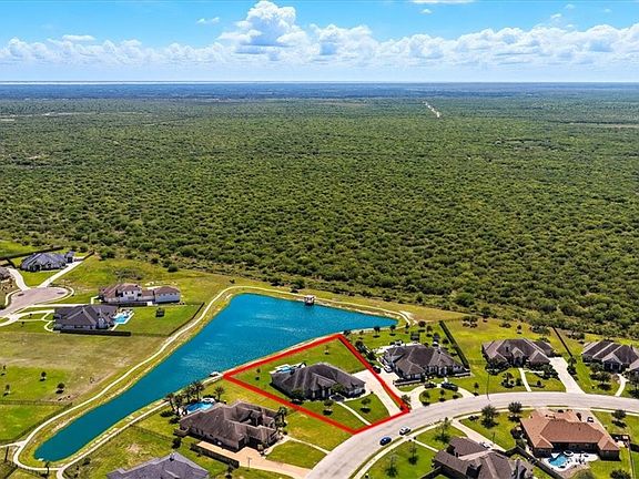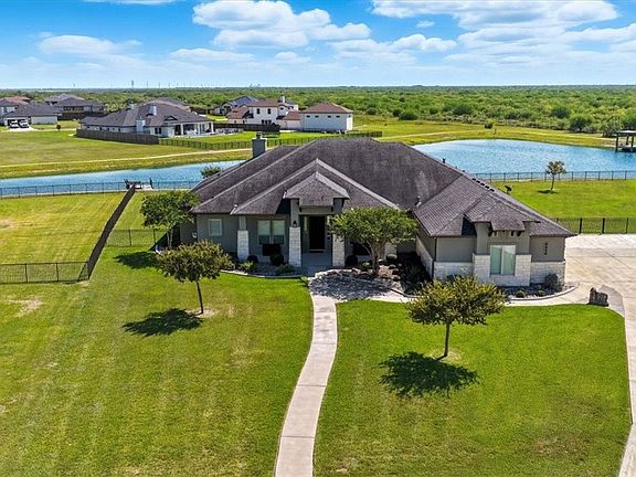 Meticulously maintained 4-bedroom, 3.5-bath stucco home in the desirable Coves at Lago Vista subdivision, set on over 0.76 acres of serene waterfront property. This 3,628 sq. ft. residence offers unobstructed views of King Ranch and its wildlife, providing breathtaking sunsets each evening. The backyard features a large saltwater pool with two water features, a slide, and an adjoining hot tub, perfect for relaxation or entertaining. Enjoy the expansive covered patio with an outdoor fireplace overlooking the lake and open landscape. Inside, the split-bedroom layout offers privacy with three dining areas, two living rooms, and an oversized chef’s kitchen with quartz and granite countertops, designer glass tile backsplash, custom cabinetry, and gourmet-grade appliances. Tall ceilings and large windows flood the home with light and capture every view. Smart features include automatic window shades, a full-house speaker system (7 in living room, 5 in game room, 2 on each patio), 14 4K security cameras, and a 22KW Generac backup generator. The luxurious primary suite offers expansive views of King Ranch, a private sitting area, direct patio and pool access, and a spa-inspired bath with separate vanities, jetted tub, walk-in shower, and massive walk-in closet. Additional highlights include a large study with multiple workstations and custom-built stained desks, a game room, a large laundry/mudroom with built-ins, side-entry three-car garage, and professional landscaping with outdoor lighting. The generous lot provides room for gardening, play, or relaxing. Located minutes from shopping, dining, and top-rated schools, this home blends tranquility, modern convenience, and timeless luxury—an extraordinary retreat for those who appreciate quality craftsmanship and refined living at its finest.