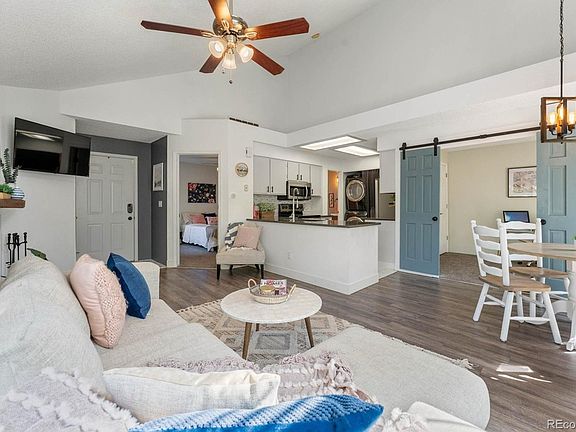 Enjoy easy living in this charming and updated two bedroom, one bathroom condo. Expansive windows flood this top floor unit with natural light, while the vaulted ceilings and an open concept layout create a spacious and airy interior. Seamlessly entertain as the kitchen, dining room and living room function as one. The kitchen features Samsung stainless steel appliances and new quartz countertops. Spacious primary suite with a walk-in closet and full bath. The second bedroom with freshly painted barn doors is perfect for a home office. The west-facing private balcony is perfect for enjoying sunsets and outdoor grilling. Plenty of storage space for skis, snowboards, paddle boards, camping gear, etc. Located within walking distance to all Belmar has to offer: restaurants, bars, entertainment. Nearby trails for walking, biking and Belmar Park. Enjoy easy access to the mountains as well as a fifteen-minute commute into downtown Denver.