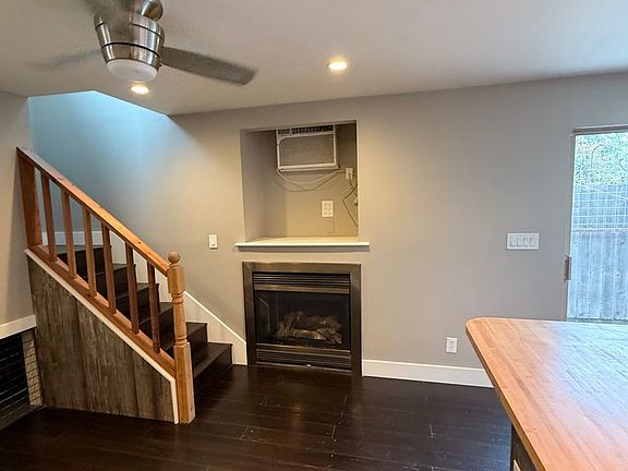 The main level features a full kitchen with stainless steel appliances, a small living room with a working fireplace, and an AC unit for year-round comfort. A stainless steel stackable washer and dryer are also included for tenant use (appliances provided without warranty).