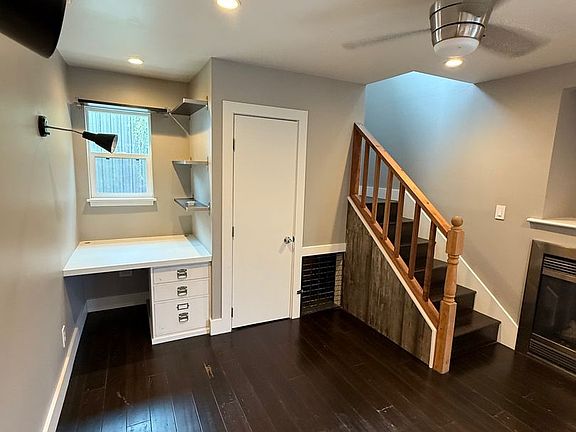 Upstairs, you'll find the bedroom with a built-in bedframe and shelving. The ADU shares a large backyard with the main house but also has its own private side yard for added outdoor space.