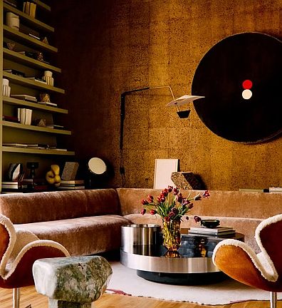 Dramatic redbrick fireplaceVintage swan chairsDynamic light-filled interiorsFloor-to-ceiling window wallsBuilt-in velvet sofaOriginal tecno chairsColumnar travertine table