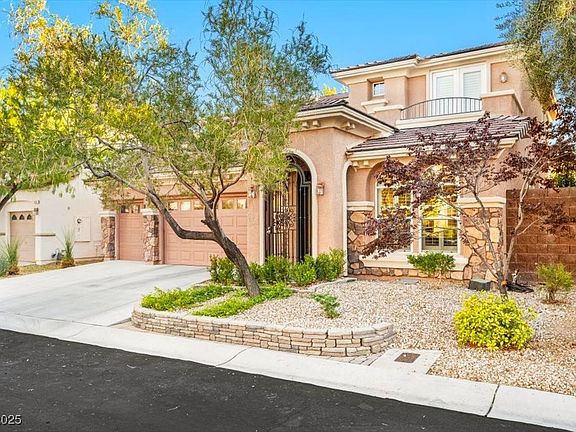 This beautiful move-in-ready Mountains Edge home offers the perfect blend of comfort and sophistication. Refined touches include plantation shutters, crown molding, 9-ft ceilings, & elegant wrought iron entry. The remodeled kitchen showcases quartz counters, custom cabinets, porcelain farm sink, stainless-steel appliances w/refrigerator, cooktop, & new dishwasher, microwave & double multi-function ovens! The open-concept family room features a custom entertainment center, fireplace, & surround sound w/TV included! While the formal living and dining areas offer elegant spaces for entertaining or quiet gatherings. The spacious primary suite boasts a sitting area, balcony, spa-inspired bathroom, & 13-ft walk-in closet, while a third bedroom also enjoys a private balcony. Plus a convenient downstairs bedroom & ¾ bath. French doors open to a 30-ft covered patio surrounded by lush vegetation, flowers, citrus trees, and tomato plants—perfect for relaxing and entertaining. Come see this home!
