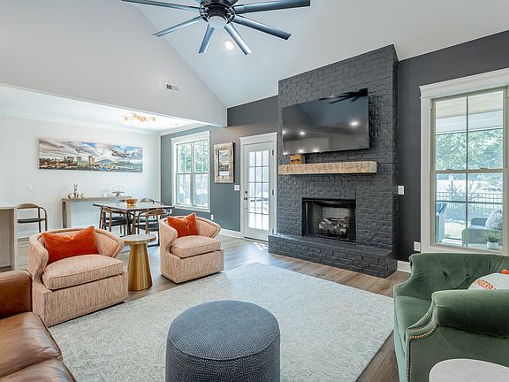 Cathedral ceilings, upgraded wood floors, painted doors, and custom storage enhance the home's character, while curated finishes elevate every space. The first level primary suite offers trey ceilings picture frame moulding, a spacious custom walk-in closet, a spa like bathroom with a soaking tub, separate shower, and dual vanity.