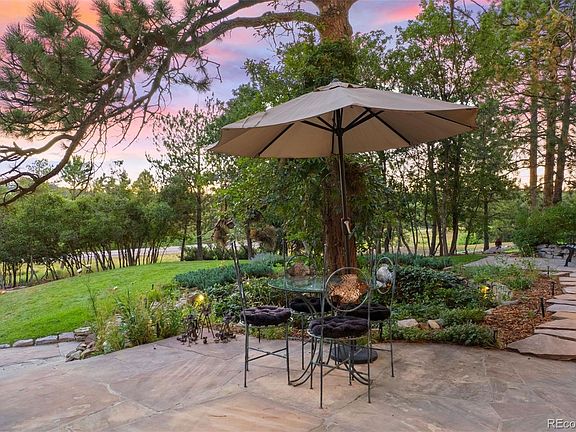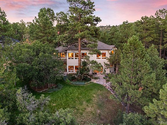 Surrounded by towering pines on a cul-de-sac, this home in The Village Castle Pines offers a beautiful blend of privacy, comfort, and nature. A flagstone walkway and front water feature welcome you to a richly detailed interior with a paneled library, formal dining room, and a gourmet kitchen with granite counters, double ovens, and an eat-in nook opening to a wraparound Trex deck. From here, enjoy mountain vistas, wildlife, and sunsets while relaxing or entertaining. The main-level primary suite is a retreat with its own deck, a two-sided fireplace, updated spa-like bath, and custom closet. The walkout lower level features a wet bar, stone fireplace, and access to multiple flagstone patios in the storybook landscaped backyard. Two lower level, en suite bedrooms and abundant storage complete the space. Recently refreshed with new flooring, updated baths, and modernized systems, this home combines timeless style, peace of mind, and extraordinary outdoor living.