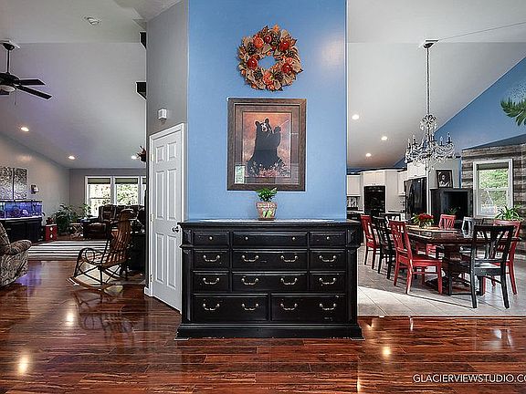 One of a kind beautiful 2800 sq ft home nestled into 3.2 acres surrounded by forest at the end of the road offering privacy. Located 5 minutes from shopping and golfing at Meadow Lake Golf Course. Open concept living room, kitchen, & dining area. Spacious kitchen has black granite countertops, double oven, a gas range sits on the 28 sq ft island with a 2nd sink, walk in pantry and partially heated tile floors. Master Suite with vaulted ceilings, master bath with claw foot tub, double vanity with granite countertops, heated tiled floors and tiled shower. Additional 2 bedrooms, full bath, & 40x16 partially finished basement. Attached 2 car insulated garage, 30x60 4 car/shop with additional side wings provide plenty of room for campers & toys. Attached RV disposal for grey/black water & a 240 volt plug in. Mother in law apartment with full bath, kitchen, king sized loft & private porch. 16x32 above ground heated swimming pool surrounded by a 6 ft chain link fence. 20x20 fire pit for outdoor entertaining. Private well provides crystal clear water and an underground sprinkler system. An Eaton generator will automatically switch on within 15 seconds of a blackout. Multiple murals painted throughout home from a local artist. Call 406-270-2291 to schedule your viewing. Qualified buyers only please.
