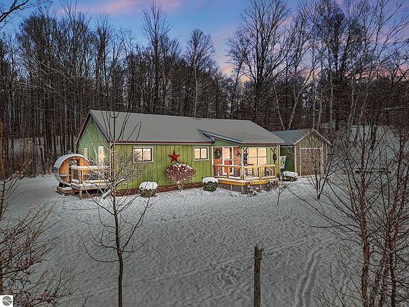 Discover the Charm of This Beautifully Updated Ranch Home! This stunning 3-bedroom, 1.5-bath ranch offers fully updated, main-floor living on just under 10 picturesque acres, complete with a serene pond and scenic trails for exploration. A standout feature is the beautiful heated sunroom, surrounded by large windows offering breathtaking views of nature—perfect for year-round relaxation. Over the past few years, this home has undergone extensive updates, including a newer metal roof, well, siding, windows, wet bar, pellet stove, flooring, modern kitchen, furnace, central air with a heat pump, built in speakers, underground irrigation system, paved driveway, and more. Every detail has been thoughtfully upgraded! The property includes a spacious main garage with three stalls, a heated workshop, a loft, along with a fourth stall in back for storage, and a newer detached one-car garage. The beautifully landscaped yard, featuring mature greenery, apple and cherry trees and a decorative waterfall, creates a peaceful and inviting outdoor oasis. Located in a highly sought-after recreational area, this home is just minutes from Caberfae Peaks Golf and Ski Resort and near ORV and snowmobile trails. With state and federal land nearby and easy access to rivers, lakes, and countless outdoor adventures, this property is a nature lover's dream and a hunter's paradise. Experience tranquility, exceptional craftsmanship, and modern convenience—all in one remarkable home! Buyer/Buyer's agent to verify all information.
