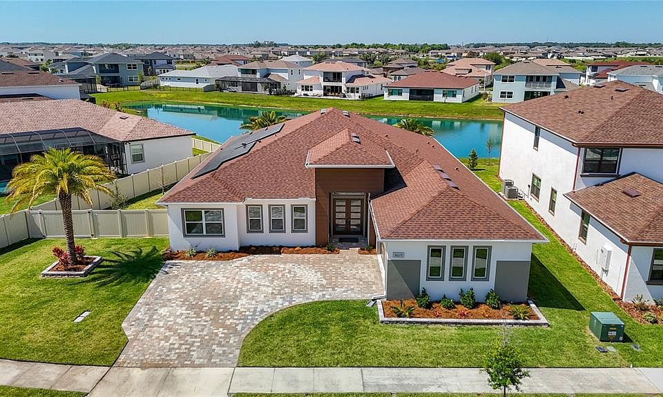 Price Improvement! Clean Inspection! Experience the epitome of modern luxury living with this stunning better than new 5-bedroom, 3 1/2-bath plus office residence nestled within the distinguished King Lake Estates, part of the sought-after Epperson Lagoon Community. This property is a steal with the sellers offering it at a loss due to work relocation. Over $75,000 in upgrades since the home was built, featuring a 10kW Solar System, widened paver driveway, enclosed and extended patio, EV charger, and a master closet and pantry of your dreams. Use our preferred lender and secure a rate below market with no points! Take advantage of Florida living not having to worry about large electric bills with the fully owned solar system (owned, not leased!). Crafted by Biscayne, this meticulously designed home boasts upscale finishes and thoughtful upgrades throughout. From the upgraded landscaping to the expansive great room, every detail has been carefully considered to meet the highest standards. Entering through the inviting front doors, you're greeted by soaring 12’ tray ceilings and an airy open floor plan, ideal for both relaxation and entertainment. The dream kitchen is a chef's delight, featuring stainless steel appliances, sleek cabinetry, quartz countertops, and a spacious island with a waterfall edge. The adjoining great room offers picturesque views of the serene pond and is wired for surround sound, perfect for movie nights. Retreat to the lavish Owner's Suite, complete with a luxurious spa-inspired bath featuring dual sinks, a massive shower, and a standalone tub. This house also has a mother-in-law suite hosting an additional bedroom and full bathroom. Further highlights include generously sized secondary bedrooms, screened-in paver lanai, walk in closets, upgraded laundry room and drop zone. Included in the laundry room is a communication tower which controls the surround sound and other ports throughout the home. The office features a glass framed door and modern cabinetry with a herringbone counter top. You will enjoy the upgraded lighting throughout the home, including ceiling fans in every bedroom and the office. Eye catching wood accent walls are featured in three bedrooms. HOA includes high speed Spectrum internet with full cable included. With amenities such as the nation's first Crystal Lagoon, Eagle’s Nest Park, and easy access to shopping and entertainment, this home offers an unparalleled lifestyle opportunity in the vibrant Tampa Bay region. Enjoy the convenience of taking your golf cart to the local Publix and Starbucks. Don't miss your chance to own this exceptional property!