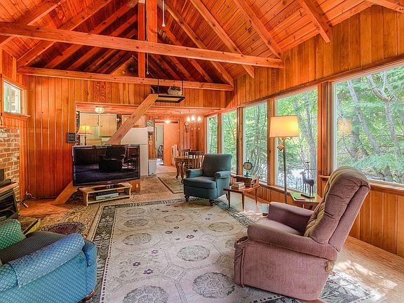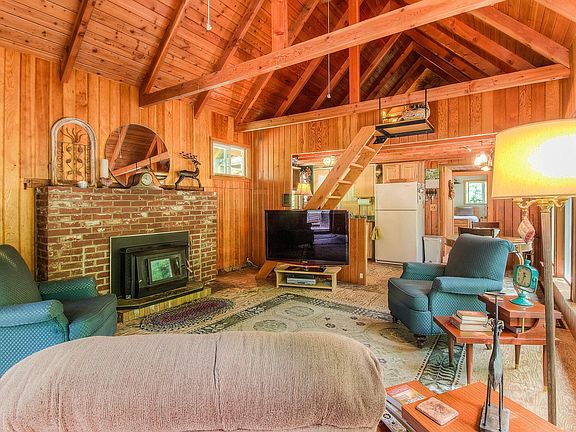 Snowmobile, 4 wheel to DNR landfrom this home on river in private, forest setting. Vaulted ceilings throughout living area, Old Brick fireplace with insert, stairs to loft open kitchen/dining-all looking to River from large picture windows. Main bedroom features hot tub ready deck, gas stove. Updated bath, instant hot water heater, new metal roof, new concrete fire resistant siding and storage.