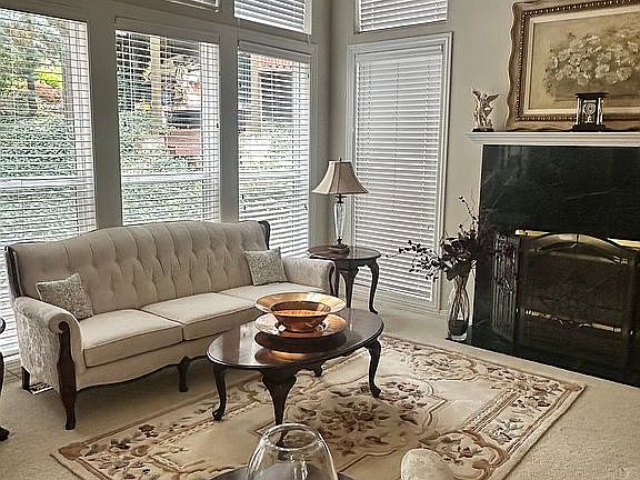 Grand Living Room: Step down into a dramatic living space featuring soaring 16-foot ceilings, a wall of windows that flood the room with natural light, and a cozy gas fireplace—an ideal setting for gatherings or relaxing evenings.
