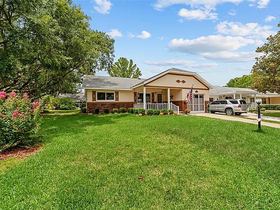 Now Offered at $169,900 - Rare End-Unit Newport Villa – Park-Like Corner Lot Here’s your chance to own an expanded Newport end-unit villa in a peaceful, park-like setting within the sought-after 55+ community of On Top of the World. Enjoy your morning coffee on the generous covered front porch while taking in the serene surroundings. Inside, the open Living and Dining areas feel bright and spacious, featuring wood-look laminate flooring throughout and ceramic tile in the bathrooms—no carpet! The Kitchen is light-filled and functional, with a wide snack bar, stylish backsplash, hanging island lights, newer appliances, and plank flooring. Relax or entertain in the oversized Great Room, complete with a wood-burning fireplace, while sliding doors open to a screened patio and convenient covered golf cart parking. This home has been carefully maintained and updated, including new windows (2024), new garage door (2025), roof (2016), AC (2010), attic fan (2015), and a solar tube that adds natural light. A home warranty is also included for added peace of mind. The Master Bedroom offers a walk-in closet and step-in shower, while the Guest Bedroom is generously sized with a deep closet, highlighting the thoughtful layout of this villa. Residents enjoy access to clubhouses, pools, fitness centers, tennis and pickleball courts, hobby studios, dog parks, and golf courses(fee based), all easily reachable by golf cart along with shopping, dining, and medical offices. This rare end-unit won’t last at $169,900—schedule your showing today!