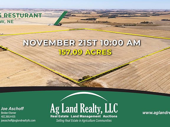 LAND AUCTION!!! November 21, 2024 10:00 am Mary's Restaurant, Plainview, NE 157.09 Acres Irrigated Cropland just 4 miles West and 2 1/2 miles North of Plainview, or 5 miles South and 1 mile East of Creighton, Ne in Antelope County. This farm is in all row crop production. The farm is equipped with a 7 tower Zimmatic pivot installed new in 1999, Sargent Irrigation Well installed in 1982, 850 GPM, 180 ft deep. 100 hp U.S electric motor installed new in 2021 and Square D electrical panel along with flowmeter. FSA reports 155.05 Cropland Acres, 128.20 Base Acres, 154 BPA PLC Yield for corn and enrolled in ARC County. Predominantly Ortello, Bazille and Paka loam soils. Gently rolling farm 1 mile off Hwy 13 or 2 1/2 miles off Hwy 20, close to major markets and open for the 2025 growing season. Promissory Note & Deed of Trust: The buyer will assume $1,251,308.39 @5.25% interest. 6 payments of $248,504.11 the first payment due 1/2/2025 and ending 1/2/2030 Legal: NE 1/4 22-28N-5W Bazile Township in Antelope County, Ne Taxes: $6,870.48 or $43.74 per acre Seller: James E. Pick Estate Directions: From Plainview go West on Hwy 20 4 miles to 532nd Ave, then North 2 1/2 miles farm is on the West side of the road. From Creighton, Ne go South on Hwy 13 5 miles to 867th Rd then 1 mile East Terms and Conditions: Cash with a 15% non-refundable down payment the day of the auction, and the balance payable in certified funds on or before closing, December 19th, 2024. The property will be sold to the highest bidder. Buyer will receive possession of the property on the day of closing. Owners' policy of title insurance will be divided equally between buyer and seller. Sale is not contingent upon buyer financing. Property is to be sold AS-IS with no warranties or guarantees implied. All bidders are urged to fully inspect the property and rely on their own conclusions. Property is sold subject to any existing leases, easements, restrictions or reservations of record if any. Announcements made the day of the auction will supersede earlier announcements, verbal or written. Ag Land Realty and its associates are representing the seller as sellers' agents and treating the buyer as a customer.