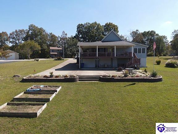 PENDING, SELLER IS ACCEPTING BACK-UPS Want a peaceful cove to swim and park your boat in? Autumn Ridge has just that! A no wake zone keeps these boats from rocking on a holiday weekend or anytime you are down fishing or swimming with the kids. The approximate 1 acre lake front lot has the dock and dock path in view of your covered porch. The spacious layout of this 4 bedroom 3 bath home is just what large families want! No need to be piled on top of each other on a rainy weekend. The unfinished basement can easily convert to a game room, bar and lounge area or more bunks if needed. Vaulted ceilings enhance the gas log fireplace in the living room area on the main floor. Glass doors open to the covered lakeside deck overlooking the dock area below the home. The sellers say they love the LVP flooring in the lake house for its ease of care and durability with fur babies and lots of traffic from grandkids and their friends. Autumn Ridge is a lovely neighborhood tucked away on Rough River Lake near Leitchfield and minutes from the Rough River State Resort Park. Perfect getaway for a busy family wanting some space to unwind. The loft area and a 2nd bedroom add to this over 2,000sq' home waiting to be yours! Don't worry about maintaining this beautiful home. Vinyl siding, a new roof from July of 2023 and covered trex decking make it pretty maintenance free! A lawn service can take care of your GENTLY sloping lake front lot and you just show up and have a great time on Rough River Lake!