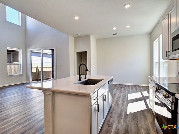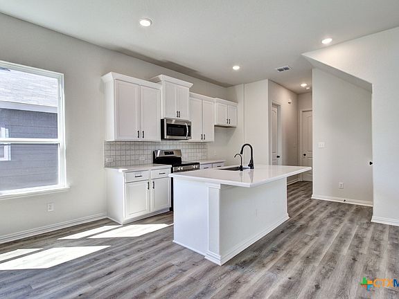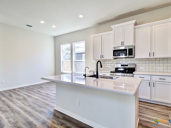 The only new home community just a golf cart ride away from Gruene Hall, the Guadalupe River, and charming downtown New Braunfels! Discover the perfect blend of convenience and comfort in the San Marcos Plan, a thoughtfully designed single story home featuring two spacious bedrooms and two bathrooms. Arrive inside to an inviting open concept layout ideal for entertaining and everyday living at Casinas at Gruene. The modern kitchen showcases sleek stainless steel electric appliances including a cooktop, oven, microwave, and dishwasher along with elegant Omegastone countertops and a deep 10 inch undermount sink. The Owner's Suite, located on the first floor along with bedroom 2, features a luxurious ceramic tile shower with a built in seat, creating a relaxing retreat. Exterior highlights include a covered patio ideal for outdoor gatherings, a two car garage, charming coach light, and a fully fenced backyard with a gate for added privacy. Experience life in one of New Braunfels' most desirable areas where comfort, style, and location come together seamlessly. Also located nearby is River Acre Park located just down the road of the Casinas at Gruene neighborhood offering residents a nearby place to relax and enjoy.