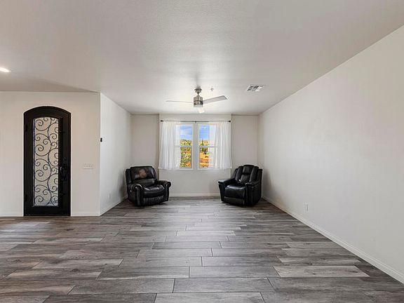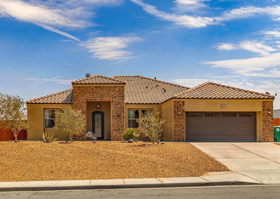 Welcome to 8680 Monument View Drive, an elevated desert retreat offering style, comfort, and sweeping views. Built in 2019, this spacious 4-bedroom, 2.50-bathroom home spans 2,364 sq. ft. on a large 0.27-acre lot surrounded by desert scenery. Inside, natural light pours through abundant windows, highlighting an open floor plan with luxury vinyl plank flooring, ceiling fans throughout, and a cozy living room fireplace. The chef's kitchen is a true centerpiece, featuring modern white glass appliances, thick granite countertops, pendant lighting, and a walk-in pantry, flowing seamlessly into the dining area with mountain views, including snow-capped peaks in the winter. The expansive master suite offers sliding glass doors to a private covered patio along with a spa-inspired bathroom boasting a double vanity, soaking tub, oversized walk-in shower, and a generous walk-in closet. Additional bedrooms are thoughtfully designed, with the third bedroom offering ensuite-style access to the second bath, perfect for guests. Outside, enjoy a beautifully landscaped desert yard with river rock detail, an expansive covered patio overlooking the mountains, and plenty of room to design your own custom pool. With its elevated setting, serene surroundings, and proximity to Joshua Tree National Park, this property blends modern comfort with the beauty of the desert lifestyle.