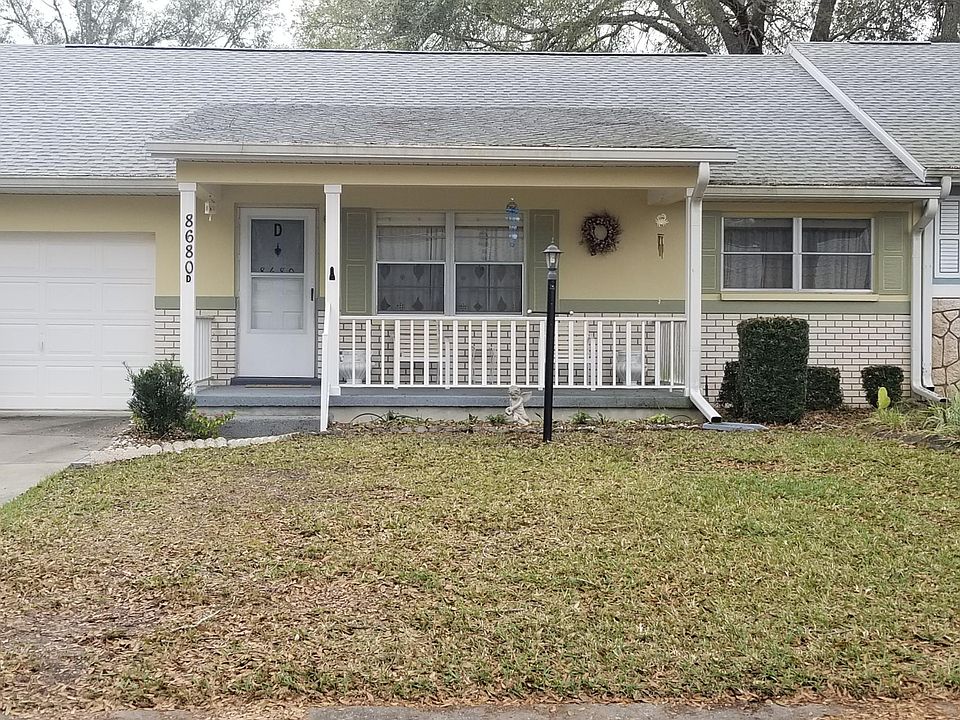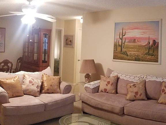 This wonderful home is one of the interior homes. It has a large covered porch that has been finished with epoxy rock and needs little upkeep. This home has a combination large living room with ample dinning area that is fully carpeted, the kitchen has a lot of counter space and stainless steel appliances, small eating space and wood textured vinyl covers the floor, a second living area is just off the kitchen and has a wall of windows and flooring to match the kitchen, out back is another covered porch, the home has a large master bedroom with carpet and a walk in closet and ensuite with walk in shower and sliding doors, second bedroom has carpet as well and a large double door closet, second bath has shower and tub combo. All walls have been painted a neutral color, cabinets and