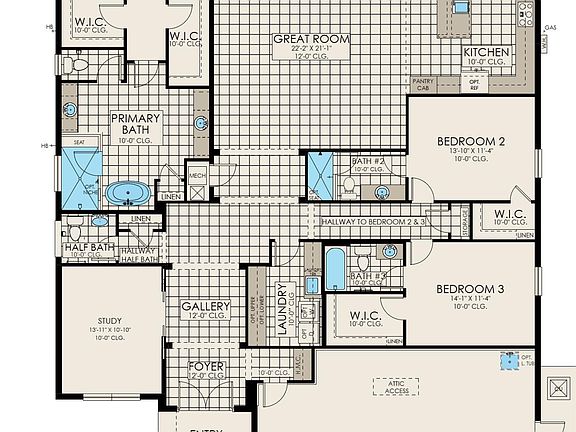This Mendocino is a luxurious three bedroom three and a half bath home with Study. The Gourmet Kitchen and spacious open Great room are at the heart of the home. The Primary bedroom has two walk-in closets and a tub and separate shower in Primary Bath.