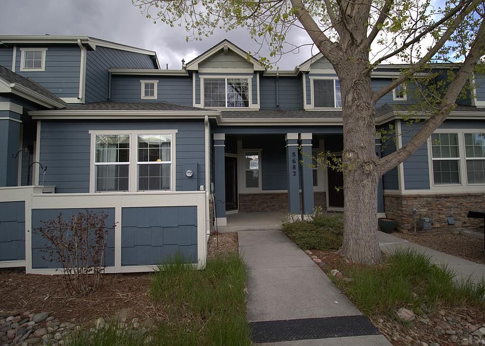 Nestled in the esteemed Wolf Ranch community and within the coveted D20 school district, this meticulously maintained two-story townhome offers an exceptional living experience. The heart of the home is its expansive kitchen featuring abundant cabinetry, a generous pantry, an inviting island, and a separate dining area perfect for hosting gatherings. Adjacent is a warm and inviting family room, complete with a cozy gas fireplace, ideal for relaxation and entertaining. Upstairs, two spacious master bedrooms await. One master bedroom boasts a vaulted ceiling and a luxurious private bath, complete with a double vanity, walk-in closet, and indulgent soaking tub. The second master bedroom features its own attached full bath, ensuring comfort and convenience for all. Step outside to discover a covered patio and charming garden area, providing an idyllic setting for outdoor dining and barbecues. The fully insulated and sheet-rocked garage offers ample storage and parking space. Enhanced with modern updates including a storm door and refreshed entry hardware, this home combines practicality with elegance. Its proximity to schools, shopping centers, Peterson Air Force Base, and the Air Force Academy ensures both convenience and accessibility. Experience the epitome of refined living in this beautiful townhome, where comfort, style, and convenience converge seamlessly.