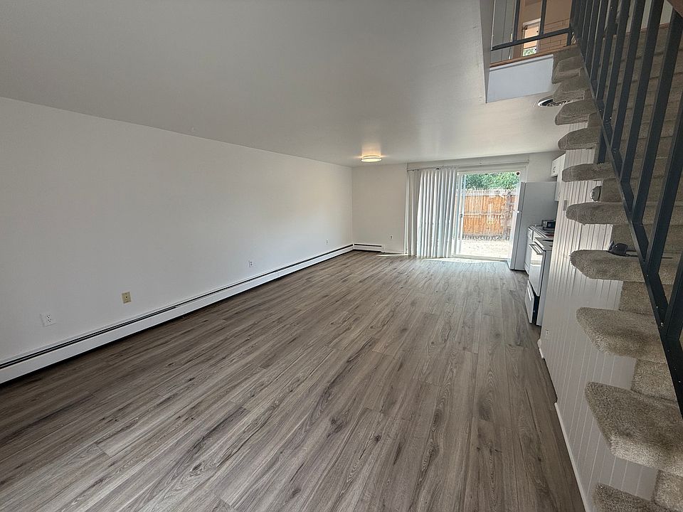 There is a spacious living area (12x14) directly connected to a large kitchen (12x12) with a dishwasher. This unit has a small storage closet as well as a fenced 16x16 patio, accessed by a sliding glass floor. There is ample parking right out front. This unit is part of a 4 plex, within a larger 3 building property. It takes 5 minutes to get to Home Depot, Costco and I70 for quick access to downtown. Central radiant baseboard heat with two zones with water included. Tenants must pay for electricity. Common area has coin operated laundry. Recycling and trash come weekly. The RTD W Line is within a 5-minute car ride as well.