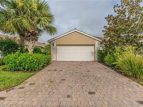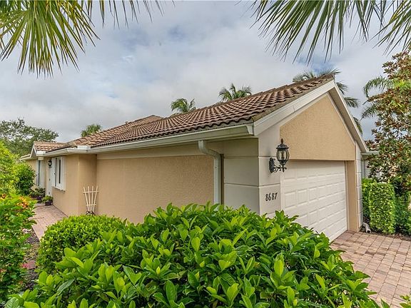 A must see in your home search is this chic, three bedrooms/two bath, attached Carrington design villa. Located in the gated community of VeronaWalk in East Naples, this furnished home is move in ready. The kitchen has been renovated with custom, glossy, black lacquer cabinetry (one with glass display doors), new stainless appliances and quartz counters. A breakfast bar offers additional seating. Stylish wallpaper and tile backsplash finish off the contemporary cooking space. A full-size laundry room houses an LG washer/dryer combo and leads to a two-car garage. LED ceiling lights, contemporary fans and new TVs are throughout this villa. Vaulted ceilings with crown molding and decorative woodwork on the primary bedroom’s ceiling add that extra touch. Easy to maintain tile floors and a fresh repaint leaves little to be done. From your covered, screened lanai you take in not only a water view but look out to two of VeronaWalk’s beautiful bridges. A spacious grassy area that leads to the water offers room should you want to relax in the sun. Situated at the end of the street, this home is quiet and traffic free. You can be storm ready with impact glass sliders and accordion shutters on the windows.