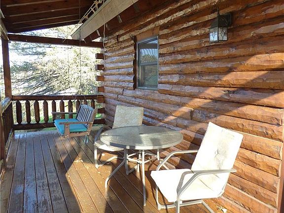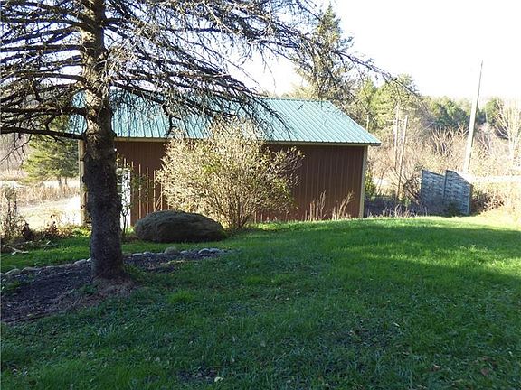 Cozy living in this Lok'n'Log' Cabin- Enter in from ground floor where a full lower level of poured concrete foundation, utilities and 'man cave' dominate! Up the stairs to 480 sq. ft. of full kitchen, dining area, showered bath, and bedroom - all with great light and good flow! Walk out to full front porch and enjoy the evening sunset! In addition enjoy storing all your toys and vehicles in an oversized two car detached garage w/plenty of storage and possible shop space. An additional garden shed completes the structures on these three pretty acres w/small stream and great views! Quick walk down the road to enter State Lands (Brookfield riding trails and State Park)!