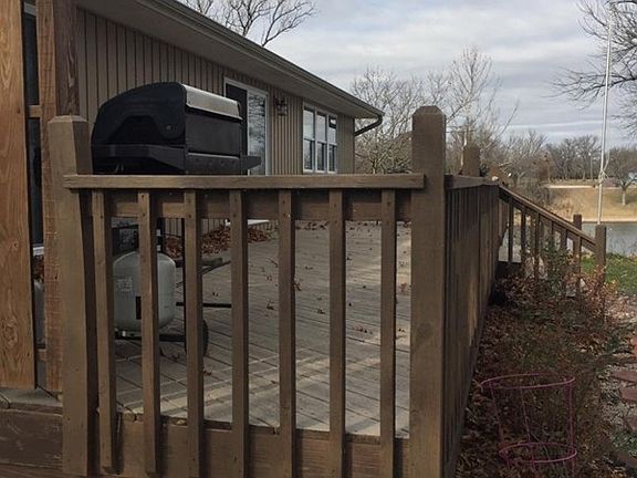 LAKE FORT SCOTT!!! Very scenic, newer home, built by Karleskint Construction on a point overlooking the large part of lake and the beach area. Large open kitchen and living area with lots of windows, 2 docks and a large deck with large views of Fort Scott Lake.