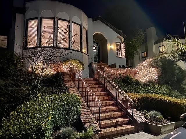 - Exterior features: Barrel front window, Coved ceilings, Fenced in backyard, Grassy park across from home, View Type: Peek-a-boo views of Bay