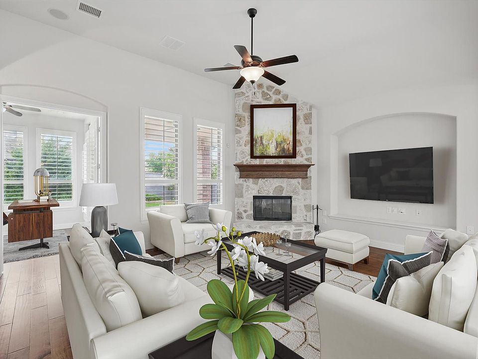 This beautifully maintained single-story home offers 3 bedrooms, 2 baths, a dedicated study, and a versatile flex space to suit your needs. Situated on a desirable corner lot, the lush landscaping enhances its curb appeal, creating a welcoming outdoor retreat. Inside is filled with natural light, it showcases meticulous care and stylish details, including stunning wood floors and elegant plantation shutters. The spacious family room, featuring a striking floor-to-ceiling stone fireplace, serves as the heart of the home, seamlessly flowing into the inviting breakfast area and open kitchen. A large island makes it perfect for gatherings and entertaining. The private primary suite, tucked at the back of the home, offers a serene escape with a generous en-suite bathroom, complete with a garden tub, walk-in shower, dual sinks with a sit-down vanity, and a spacious walk-in closet. Located in the vibrant Union Park community, enjoy an array of amenities including a community pool, fitness center, sand volleyball courts, walking trails, playgrounds, and year-round events. Just a short five-minute drive to Costco, HEB, a variety of dining and shopping options, and several favorite coffee spots—this home truly embodies comfort and convenience!