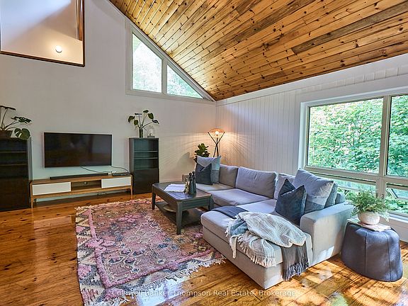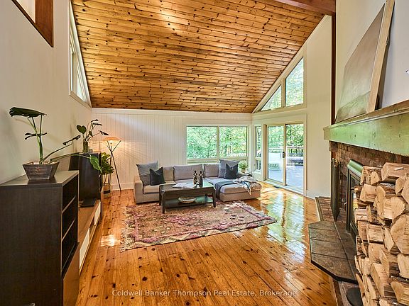 **Vendor financing available** A vendor take-back mortgage may be available for qualified buyers, making this exceptional property even more accessible. This one-of-a-kind residence blends modern style with timeless warmth and offers complete privacy, exceptional flow, and a cozy yet spacious design. Spanning three floors of thoughtfully planned living space, this home invites you to spread out while staying connected to its heart, the dramatic fireplace accent wall in the sunken living room, framed by soaring ceilings and an abundance of windows. Warm wood accents carry through the new custom kitchen, dining area, and living space, leading into a beautiful Muskoka Room and expansive deck, an entertainers dream. The walkout lower level adds incredible versatility, featuring a bedroom area, family room with another showpiece fireplace, office nook, and kitchenette, perfect for guests or extended family. Outdoors, the property is nothing short of spectacular. With over 1,300 feet of road frontage and more than 6 acres of wooded beauty, you will enjoy mature trees, stunning gardens, a fire pit, extensive walking trails, and striking rock outcroppings as your backdrop. A newly constructed three-car detached garage with loft space above provides exceptional storage, workshop potential, or future living space, and a concrete pad halfway up the driveway offers additional possibilities for future development. A turnkey furniture package is available to make moving in effortless. Located just minutes from Huntsville and public access to Mary Lake, this home is ideally situated. Huntsville is an amazing and growing community, highly sought after for its year-round recreation, abundant amenities, and world-class dining, all within easy reach.