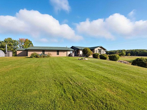 Who says you can't have it all! Enjoy room to roam on 32 acres just minutes from town. This 3300 sq ft home features 4 bedrooms, 3 baths, a 3 car attached garage including one stall with infloor heat, a detached 1 car garage and large carport for all the toys. Property is filled with apple trees, rhubarb, blueberries, rasberries, lots of perrenials, and deer stands. The appliances are less than 2 years old, the roof is 3 years old and this highly efficient home has a brand new Hvac system. The heating system can be used with propane, electric, or an outside wood boiler. Enjoy the infloor heat in the Huge lower level walkout family room. Lots of possibilities with 18 acres of open space and 14 acres of woods.