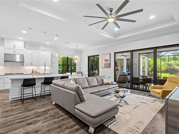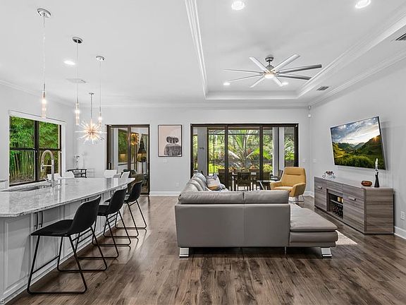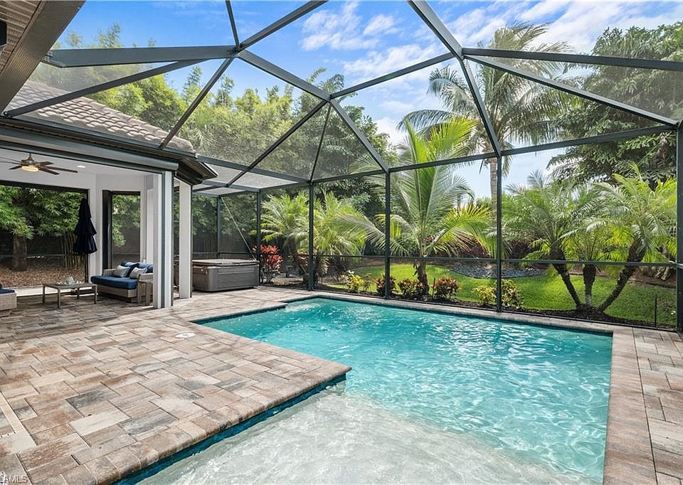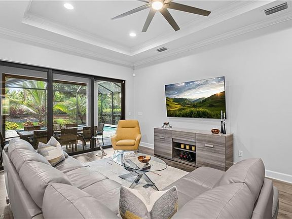 This beautiful 3 Bedroom plus Den, 2.5 Bath “Farnese” floorplan home is situated at the end of a quiet cul-de-sac street on an extremely private corner lot with southern rear exposure. The great room style floorplan with two sets of sliding glass doors to the extended covered lanai makes this home perfect for entertaining. Entertain family and friends around your heated pool with sunshelf, jaccuzzi, firepit area, and pavered side yard which lends itself to a game of corn hole/bags. Storm ready with hurricane impact windows/doors and motorzed roll down hurricane screens on the lanai openings. A long list of special features include: extended 2 car garage (24’x20’); Cambria quartz countertops; Hunter Douglas window treatments; custom master closet built-ins; solid core interior doors; crown molding; recently sealed driveway and lanai pavers; lush landscaping; and more! This property also comes with a Club/Sports Membership, granting full access to all the amenities of Esplanade Golf & Country Club (limited golf opportunities all year round!). These include the resort pool with cabanas and a poolside Bahama Bar, tennis and pickleball courts, bocce, a Koquina Day Spa, a fitness center, and a dog park. There are also 14 miles of trails and an 18-hole private golf course. On-site dining options include a restaurant, bar, wine tasting room, and a Starbucks-style café. The total quarterly fee of just $2,327 include property landscaping maintenance and full access to all the resort-style living amenities at Esplanade. This home offers a perfect blend of comfort, luxury, and active living, making it a truly unique and appealing option in Naples.