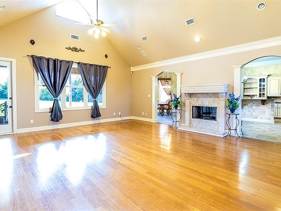 Absolutely stunning home in this gated community! Beautiful exterior has double door entry and column accents inside. Vaulted living rm with distinctive double sided fireplace carries you into a very open kitchen! Stained concrete floors, walk-in pantry, granite, 2 drawer dishwasher, & wine cooler! Custom cabinetry has pull-outs & glass doors at the pass thru to large formal Dining! Computer center close by; faux paint touches throughout. 2 customized bedrms down share jack-n-jill bath; powder room near kit. Walk through the laundry room (w/counters & sink) to master closet! Gorgeous bath with dual shower, TV cabinet, 6' tub graced w/chandelier and more! Wood floors in bedroom pretty faux paint. Upstairs, enjoy the bedroom/den suite and bath! 3 car garage plus workshop. Home has Surround sound, central vac. Home sits pretty on a very private cul de sac lot--backs up to the back yard and field of Vaughn Rd Baptist Church!