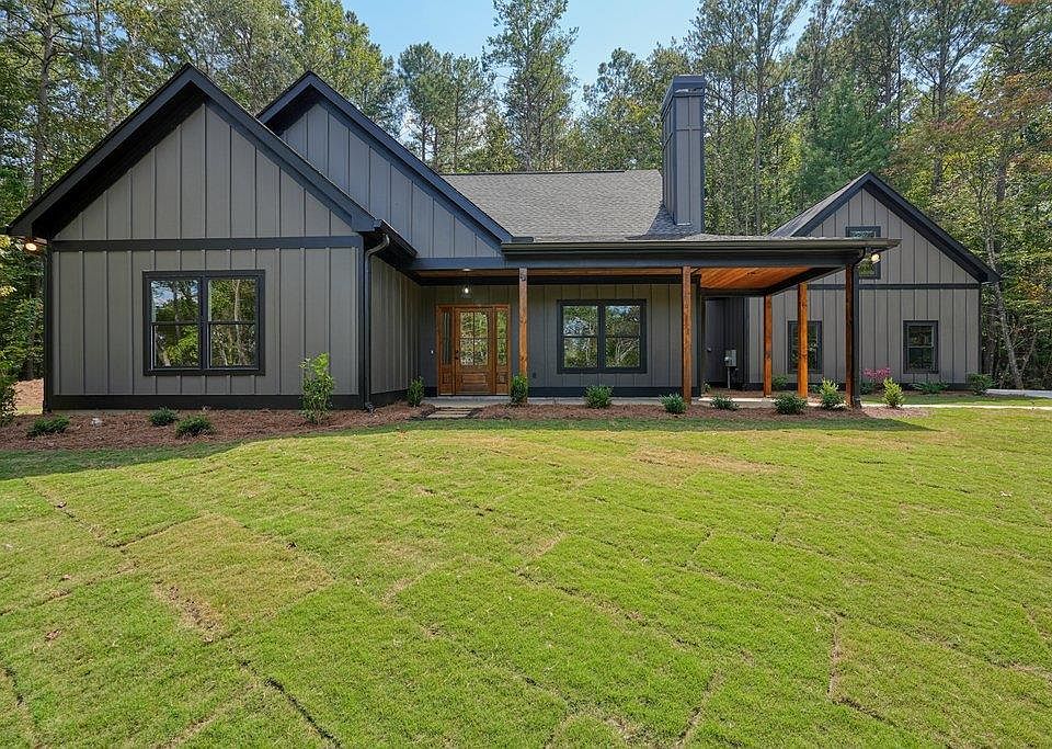 **New Construction - Private Retreat with Wooded Views** Set back from the road for added privacy, this charming new construction home offers serene wooded views and a welcoming large L-shaped front porch with beautiful stained tongue and grove ceiling - perfect for relaxing and taking in the surroundings of this gorgeous sodded and landscaped property. Step inside to a stunning vaulted great room where the stained tongue and groove ceiling continues and features a striking stone fireplace. The open dining area flows seamlessly into a beautiful farmhouse-style kitchen with crisp white cabinetry and quartz countertops - ideal for both everyday living and entertaining. A large versatile bonus room over the garage provides the perfect space for a home office, playroom, or flex space. Your future home is move in ready - Don't wait, schedule your showing today!