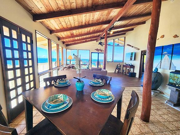 The kitchen features a Dutch door entry, Koa cabinets & a wet bar & an open dining area & more ocean views.