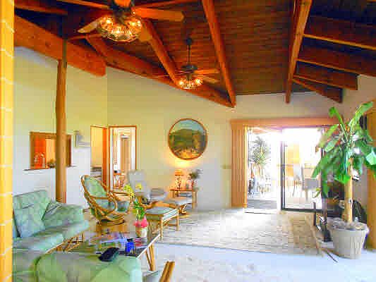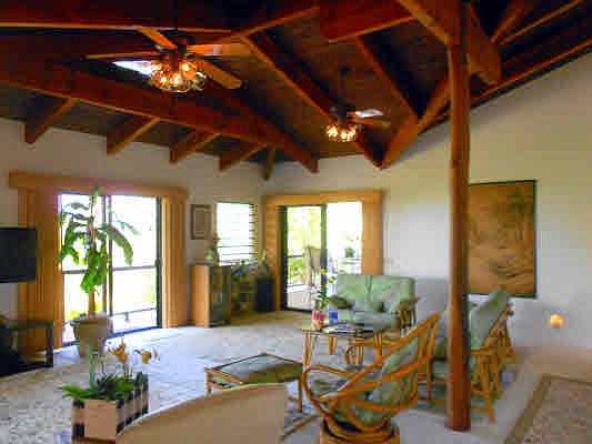 BEACH HOUSE, GUEST QUARTERS, OCEAN VIEWS!Hawaiiana Redwood home is a 1 minute walk to swim, snorkel, kayak or fish.Open beams ceilings, large living area & country kitchen with dining area, pantry & pass through. 2 lanais, garage & work bench, lots of storage & plenty of parking.Located on corner lot with Palms, pineapple & mango with an easy care yard. 2 bedroom, 2 bath upstairs, both bedrooms open to their own lanai. Great downstairs guest quarters with own entry & lanai.Woven bamboo window & slider coverings are included.Monier tiled roof, lava rock walls.Boat lovers, You may drop anchor in the bay for 72 hours!Complete with 2 catchment tanks w/approx total of 18K gallons in great condition. Clean, pristine & move in ready makes this a must see beach house.Some furniture is negotiable.