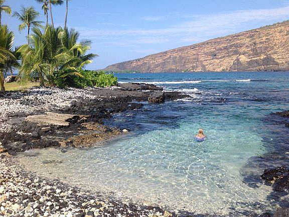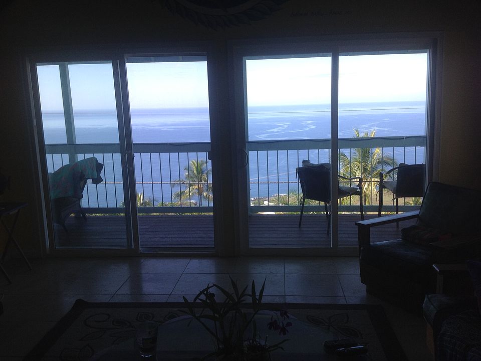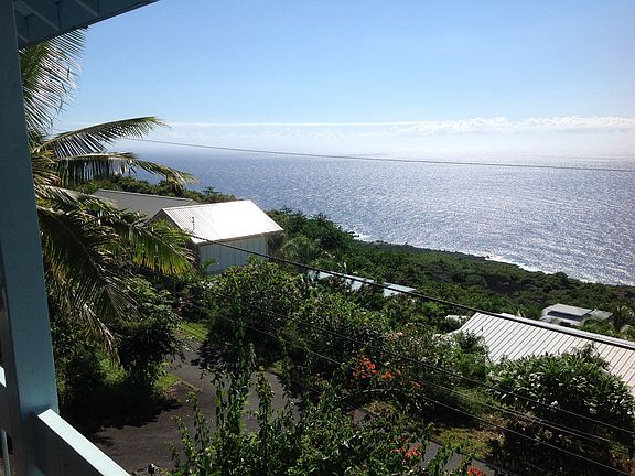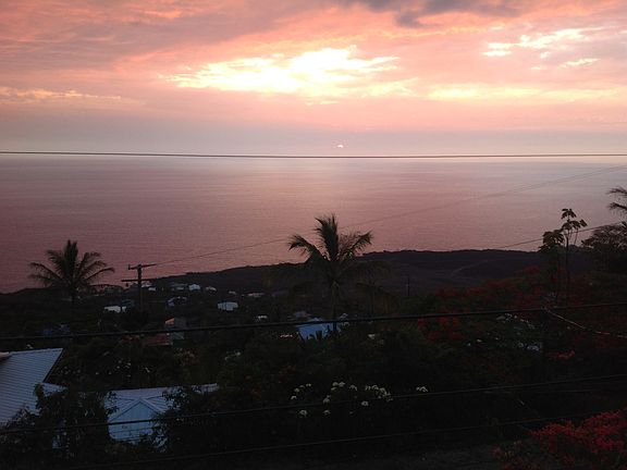 OCEAN & SUNSET VIEW HOME IN BEACH COMMUNITY. 2 bedroom, 2 bath light, bright & airy home with open beam ceilings, wood & tiled floors, kitchen with newer appliances. Master bath with walk in tiled shower. Master bedroom with ocean views is currently used as a music/sound room. Guest bath with full tiled tub/shower. Upgraded light fixtures & ceiling fans. Laundry & storage, 2 car carport. Tropical landscaped tiered front yard. Enjoy surf, sunsets & whale watching from your lanai, kitchen, living area & master bedroom. Walk or drive to the beach or beach park for great snorkeling, swimming, kayaking or diving.Also a 6 acre trail park. I believe this is the best price, best value in Kona Paradise.