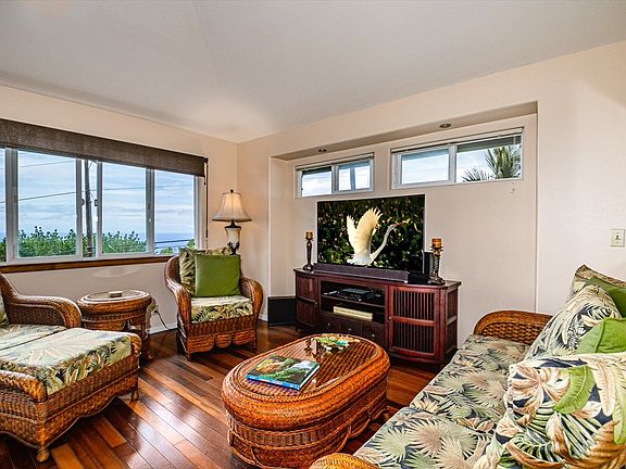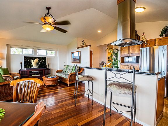 Quality and comfort exude from this lovingly maintained home in Kona Paradise. Enjoy a beautiful sunset from the comfortable lanai, treat yourself to a myriad of vegetables and fruit growing on the property, or invite friends over for a fun game or two of bocce on your own court. And it just gets better when you step through the custom carved front door into this home. No detail has been skipped. The kitchen boasts gorgeous custom koa kitchen cabinets, granite counters and backsplash, and stainless-steel appliances. The stunning stainless-steel range hood adds a smart taste of modern flair to the elegance of the decor. The warm and inviting Brazilian hardwood flooring in the great room, master bedroom, and hallways is complemented by travertine tile in the remainder of the home. Large windows across the entire ocean-facing side of the house allow for amazing views from every room. The split floor plan gives the master suite the feel of a private oasis. With its cedar-lined closet, ample master bathroom with walk-in shower, rainforest marble counters, and koa cabinetry, you'll want to linger a little longer in the morning. Providing separation from the main part of the house is the large enclosed lanai, which can serve as a recreation room or additional gathering space. The lanai features a wet bar, has large screen windows facing the ocean, and is connected to main living area by french doors. You'll find the two guest bedrooms at the other end of the house. These are served by the second bathroom, which has finishes and fixtures that match those of the master bathroom. At every stop you will see tasteful trimwork and attention to detail, right down to the well-crafted closet shelves.Other features of the home include Trex decking on the lanai, a 10,000-gallon catchment tank with UV filter, solar hot water, Milgard windows and sliders, an alarm system, a two-car carport, a laundry room, tiered gardens, and numerous custom concrete pavers.