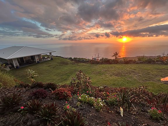 Custom built 2023 home! This 3-bedroom, 2-bath home showcasing dramatic drop-off views along the coastline from south to north, with nightly sunsets and even distant views of Maui. The open floor plan is designed for entertaining, with spacious lanais perfect for enjoying ocean breezes or dining against a stunning sunset backdrop. The primary suite also features its own private lanai—a peaceful retreat where you can sip morning coffee, read a book, or simply relax. The kitchen is a showpiece, highlighted by a bamboo island with a built-in cooktop, creating both beauty and functionality. Set on five acres, the property already produces bananas, pineapples, and a variety of citrus, with ample space ready for additional planting. The favorable elevation and rainfall make this location ideal for cultivating a wide range of tropical fruits and flowers. This property is part of a small gated subdivision, offering both privacy and security, while providing easy access to the highway. A rare combination of modern comfort, acreage, and panoramic Big Island beauty. Don’t miss the attached virtual tour!