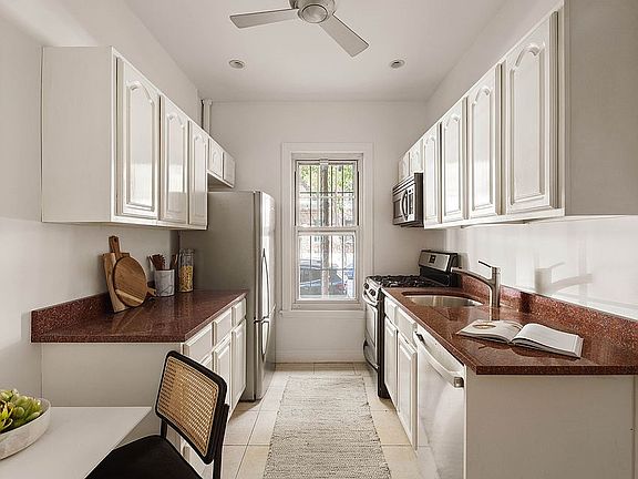 Located on the parlor level, a few steps up, this warm and inviting home welcomes you with a gracious foyer where you immediately notice the dark stained classic oak floors. Off the gallery is a generously sized windowed kitchen complete with ample shaker white cabinetry, a full-size stainless steel appliance suite, granite counters and a cozy dining nook. Just adjacent, you’ll find a convenient reach-in closet for all your storage needs. The bathroom is accented by stained-glass details, a deep soaking tub, pedestal sink, and additional storage.