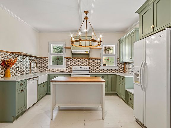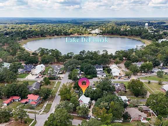 Character in every way, this beautifully maintained home sits on a corner lot just one block from Lake DeFuniak in the historic district. The heart pine floors gleam, complemented by tall windows with original glass, high ceilings, and vintage doors and hardware that preserve its historic charm. The completely renovated kitchen features custom inset cabinetry, quartz and butcher block countertops and a new backsplash. Both bathrooms have been tastefully updated, and the master bath and laundry now include new tile flooring. The master suite is located on the main level, with three additional bedrooms and a full bath upstairs. Two spacious landing areas offer flexibility for an office, playroom, or sitting space. The distinctive split staircase adds architectural interest, and with a new HVAC (2 units) and new water heater, you can enjoy the relief of knowing you have years of systems' life left! The screened porch off the kitchen provides an inviting space for relaxing or entertaining. A new brick walkway enhances the welcoming entry, and a small detached garage and storage building provide additional utility space. The location is exceptional - stepping out the front door to go walk Lake DeFuniak is a true gift! Walk or ride to downtown and enjoy all that small town life has to offer.