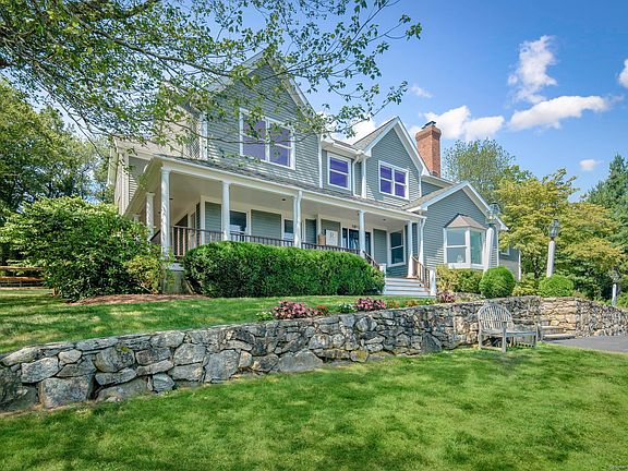 Set high atop a ridge in one of Wilton's most desirable neighborhoods, offering STUNNING views of expansive landscape from nearly every room as well as its wraparound porch, this magnificent, 5/6 BR farmhouse Colonial is a charming yet sophisticated home for all 4 seasons. Front entrance boasts a 2-story foyer w/custom bookcases. Gorgeous living room offers a floor-to-ceiling fieldstone fireplace, wraparound bookcases, and a large bay window w/inviting window seat. French doors lead to a large, gourmet eat-in-kitchen w/new pantry & wine bar, as well as access to the lovely stone patio. Adjacent handsome den/library, w/patio & front porch access, offers custom built-ins & french doors. Host memorable dinner parties from the gracious dining room w/elegant pocket doors & swaying vista. Upstairs primary bedroom suite is complete w/vaulted ceiling, walk-in closets, & primary bath. Other upstairs highlights include 4 bedrooms, office/BR with vaulted ceiling, 2 full baths and a fabulous family room with large closets. The home's exterior is truly a private oasis, perfect for entertaining. The park-like manicured property to the rear of the home offers a renovated stone patio, magnificent gunite pool, lovely plantings, generous lawn space, & new outdoor shower. To the front, enjoy a private front-row seat to spectacular Wilton town fireworks, vibrant foliage & one of the best sledding hills in the area. Convenient & serene property is a rare find. See supplements for updates. A GEM!