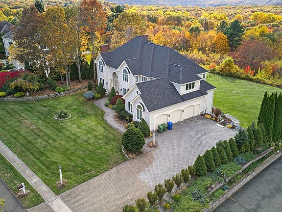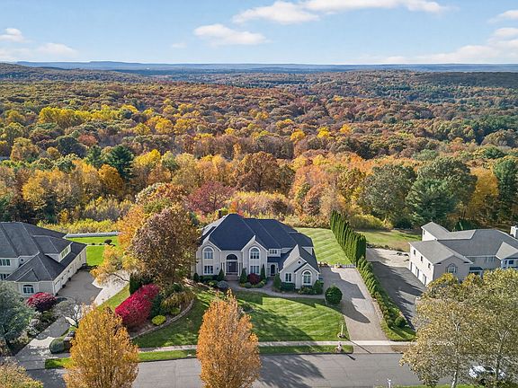 Simply stunning 5-bedroom, 5.5-bath custom Colonial on 1.73 acres in one of Glastonbury's premier hilltop neighborhoods. With over 5,300 sq. ft. of elegant living space plus 1,750 sq. ft. of finished lower-level flex space, this home offers panoramic year-round views of the CT River Valley. A grand two-story foyer with sweeping staircase and Waterford crystal chandelier leads to spacious formal rooms, a light-filled great room with granite fireplace, and a private library with custom cherry built-ins. The showpiece kitchen features double crystal chandeliers, granite countertops, a massive center island, GE Profile appliances, and walls of windows showcasing breathtaking scenery. French doors open to a 750 sq. ft. cedar deck perfect for entertaining. The first-floor bedroom suite offers comfort and versatility for guests or multigenerational living. Upstairs, the primary suite boasts a turret sitting area, spa bath, and dressing room, plus three additional spacious bedrooms with en suite or shared baths. Recent updates include new roof (2020), new Trane HVAC systems (2022 & 2024), Weil-McLain boiler (2023), whole-house generator, and Hunter irrigation system. Enjoy privacy, elegance, and convenience just minutes to Glastonbury Center and top-rated schools.