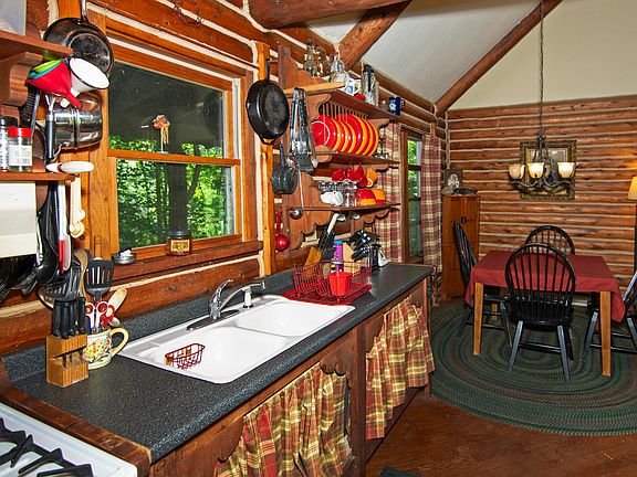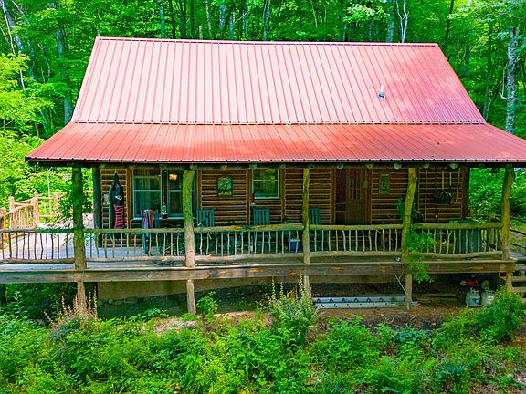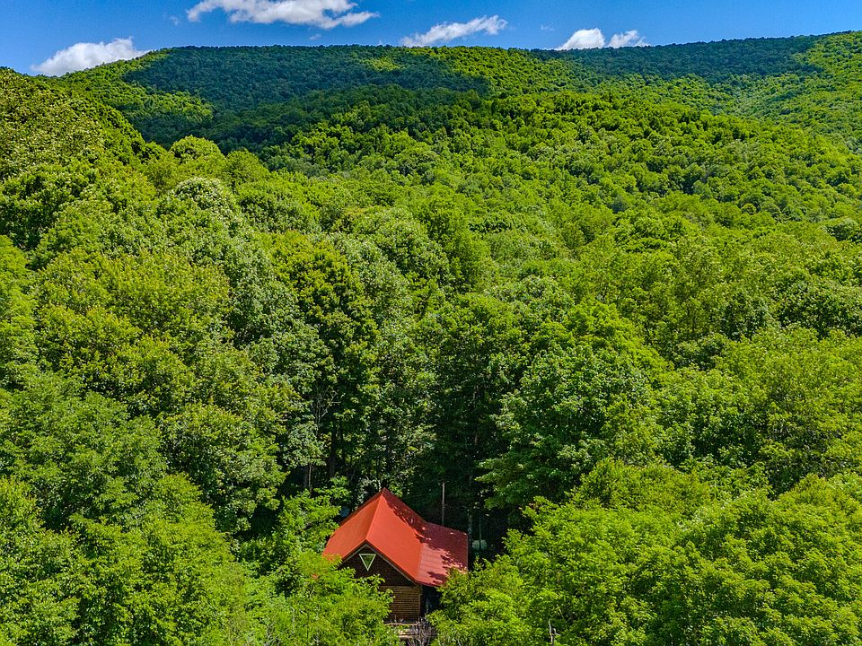 This Red Cedar cabin named Soaring Leaf is the epitome of a secluded retreat property. Originally built to be part of a cabin retreat resort this property now has over four and half acres to itself. Milled and built onsite, this sturdy home with cathedral ceilings and a stone fireplace is spirited away from the world surrounded by sun dappled forest sitting just above a trout stream. The home features an eight-foot covered sitting porch on the front, a wider star watching deck on the side, and a generous amount of interior living space. This home is a true log cabin with exposed log beams inside, wood floors, a stone hearth below the gas fireplace, and a second-floor mezzanine sleeping loft. With all of the outdoor adventures located nearby this cabin makes a great base of operations and will quickly become a favorite destination for family and friends.