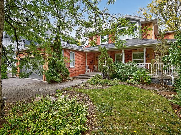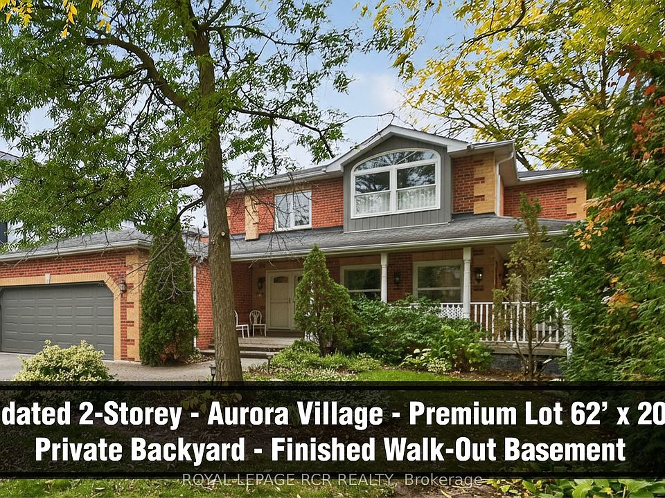 Charming and Updated Aurora Village 2-Storey on a premium 62ft x 209ft lot nestled into the Luxurious Kennedy Street West neighbourhood boasting desirable schools, gorgeous parks, and a quick walk to Yonge Street restaurants and amenities. The stately brick exterior is complemented by a wrap-around porch, double-car garage, and long driveway. Inside, the open-concept main floor is bathed in natural light and features a spacious living room complete with large windows and hardwood floors that flow into an elegant dining room with a bay window and walk-out to the wrap-around porch. The modern kitchen features light wood cabinetry, Caesarstone countertops, a centre island with breakfast bar, and direct deck access. The bright eat-in breakfast areas offers scenic backyard views. The family room impresses with a brick gas fireplace, wooden mantel, 11' vaulted ceilings, and sliding doors to the backyard. Convenient main floor laundry with side entrance. Upstairs, the primary bedroom is a luxurious retreat with a spa-like ensuite, sitting area overlooking the backyard, adjoining dressing room, and generous storage. The spacious and bright Finished Basement is complete with 3pc bathroom, recreation room, cozy fireplace, built-in shelving, large above-grade windows, 5th bedroom, and a walk-out that leads into the beautiful backyard is perfect for extended family. The private and expansive backyard oasis features lush greenery, mature trees, multiple seating areas, spacious deck, glass railings, and a cozy patio.