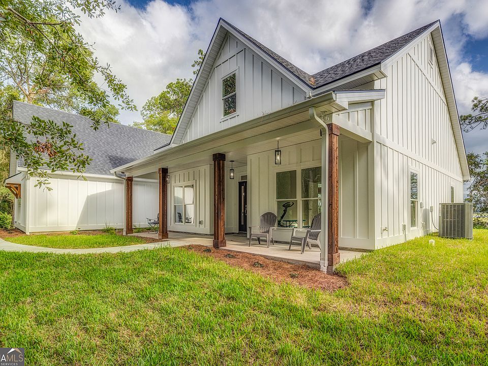 Nestled on a serene peninsula at the end of a quiet cul-de-sac, this brand-new Craftsman-style home at 87 Lighthouse Way in Woodbine, GA 31569 offers a tranquil retreat with approximately 400 feet of private waterfront along this deepwater property on Crooked River. Priced at $824,900, the 2,200 square-foot residence features three bedrooms and two-and-a-half bathrooms, designed with a split floor plan that emphasizes comfort and flow. The property includes dock rights, allowing for the addition of a personal dock, pavilion, and boat lift, with a seawall just steps from the marsh and river, inviting peaceful mornings watching the water. Inside, the home exudes quiet luxury with cathedral ceilings accented by exposed beams in the great room, where a cozy fireplace serves as a focal point. Expansive windows flood the space with natural light, framing captivating river views that blend seamlessly with the outdoors. The gourmet kitchen is a haven for relaxed gatherings, boasting a spacious island topped with granite countertops, stainless steel appliances including a wall oven and cooktop with vent hood, a charming farmhouse sink, and a large walk-in pantry. The master suite provides a private sanctuary, complete with river-facing windows, a trey ceiling, an expansive walk-in closet, and a spa-like bathroom featuring a separate tiled shower with rain head, dual vanities with marble countertops and a seated vanity area, a water closet, two linen closets, and pre-wiring on a dedicated 20-amp circuit for a potential sauna. On the opposite side, two additional bedrooms each offer walk-in closets, ensuring ample space for family or guests. Thoughtful details enhance the home's efficiency and versatility, including a three-car garage, abundant attic storage with plywood flooring and blown insulation for optimal temperature control, a 400-amp electrical panel with a separate 100-amp sub-panel for future additions like a pool, dock, or hot tub, dedicated breakers for a whole-home generator and electric vehicle charger, separate dedicated 20-amp circuit for a future irrigation well, and a sprinkler system to irrigate all of the brand new Saint Augustine sod. The septic system includes a pump and alarm for reliable operation. Entry is through a welcoming foyer and front porch, while the back patio, with its hardwood ceilings and pre-wiring for a TV, extends the living space outdoors in a subtle, elegant manner. Situated in the secure, gated community of Misty Harbor, residents enjoy access to well-maintained amenities such as tennis courts, a playground, swimming pool, picnic areas, a community room, boat and RV storage, a marina, boat launch, and pavilions with fire pits, all fostering a sense of calm community living. Conveniently located just 20 minutes from Kings Bay Submarine Base, 35 minutes from Jacksonville International Airport and Brunswick, GA, and 50 minutes from Jekyll Island, GA, the property also provides easy deepwater access to Cumberland Island, Fernandina Beach, and the Atlantic Ocean once a dock is built, making it an ideal spot for those seeking a harmonious blend of seclusion and connectivity.