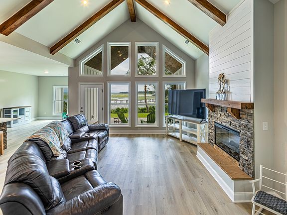 Cozy fireplacePrivate waterfrontThree-car garageSpacious islandExposed beamsDeepwater propertyCaptivating river views
