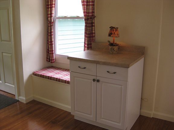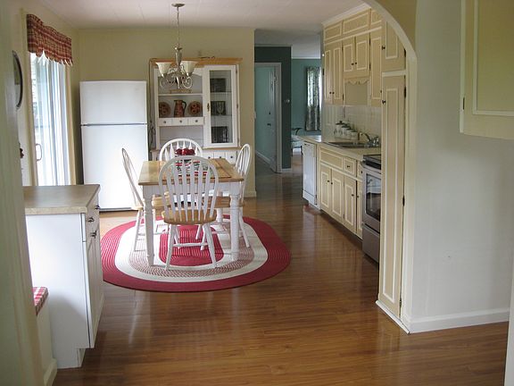 Country Home on .6 acre. Spacious newly updated one story home with a master bedroom with it's own bath + 2 bedrooms with a shared bath. At the driveway side you enter a mud room area, with closets and a large bright, cheerful kitchen with lots of counter space & cabinets, the dining area has sliding door to the private deck in the back yard for barbecues. The front of the house has a covered porch for the rockers. ( one could easily screen this porch) from the porch you enter into a bright and pleasant living room with windows on 2 sides. Hardwood laminate floors are though out the living room, eat-in kitchen, hall and master bedroom. Separate 1 car garage, 1,225 square feet of living space. Community water/sewer Taxes $493.64 Town/County $298.41 School