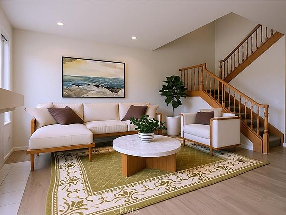 New Spanish tile roof, new luxury vinyl plank flooring downstairs and new carpet upstairs, quartz double-sink vanity in the primary bath, updated garage with epoxy floors, newer door/opener, and laundry area, central air, mirrored closet doors, and recessed lighting. The main floor includes a powder room and direct access to the two-car garage. Upstairs, you’ll find a versatile loft (ideal for a home office or easily converted to a third bedroom), a spacious primary suite with vaulted ceilings and walk-in closet, plus a secondary bedroom with French doors to its own balcony.