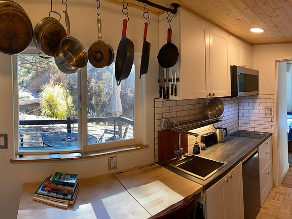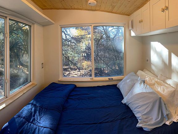 This brand new Casita follows European design principles for maximum space efficiency, and creating a big open feel through large windows, big views, and lots of light. The living room area has a couch that folds into an extra bed. There is a desk for getting your work done. The dining area can seat three people. The kitchen is fully furnished with new appliances, cast-iron pans, stainless steel pots, and a convection oven. The space feels much bigger than it actually is, has lots of storage, and is cozy.
