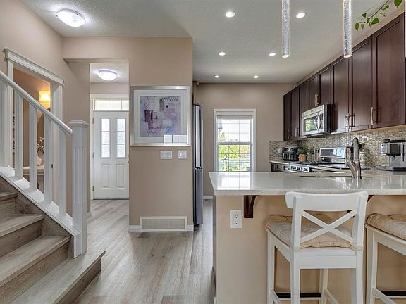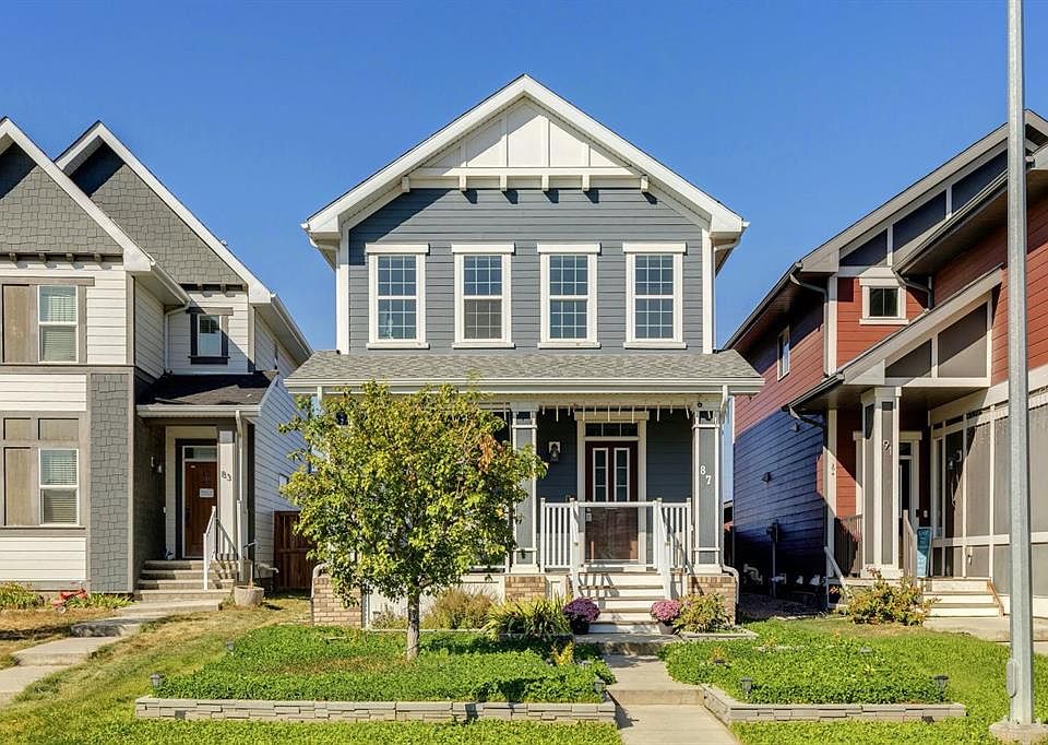 Wow! THIS IS IT! Beautifully upgraded 3-bedroom, 2.5-bath home with amazing curb appeal. Located in the sought-after Mahogany lake community, this home offers all the perks of a lake lifestyle to enjoy year-round. The eco-friendly, low-maintenance front clover lawn is complemented by perennial flowers, a custom stone wall with underground drainage, and a sunny south-facing front porch with new glass railing and sun screens, the perfect spot for your morning coffee. Inside, the chef’s delight kitchen showcases quartz countertops, a wrap-around island, pendant lighting, and upgraded stainless steel appliances including a gas stove and Samsung Smart Fridge with Beverage Centre. The open flow connects seamlessly to the dining area and cozy family room, highlighted by large backyard windows with automated blackout curtains. Step outside to your private yard with garden beds, sour cherry and plum trees, and a 20’ x 21’ concrete pad with power installed, ready for a future garage or perfect as an outdoor entertaining patio. Upstairs, the spacious primary retreat features a 4-piece ensuite and downtown skyline views. Two additional well-sized bedrooms and another full bathroom complete the level. Bonus touches include smart remote window coverings with hub control, video doorbells, and a smart thermostat. The finished basement offers a versatile recreation space with a raised removable floor currently designed as a wellness and yoga area, perfect for fitness, relaxation, or play (even a fun dance floor). If preferred, the floor can easily be removed to open up the space for a more traditional rec room layout. Laundry, storage, and a rough-in for an additional bathroom complete the lower level. For peace of mind, enjoy a new roof (2020), new vinyl plank flooring (2024), durable Hardie Plank siding, and a quiet street location. Comfort upgrades include central A/C, loads of smart features, and modern finishes throughout. Move-in ready and waiting for a new family. This Mahogany gem is a must see!